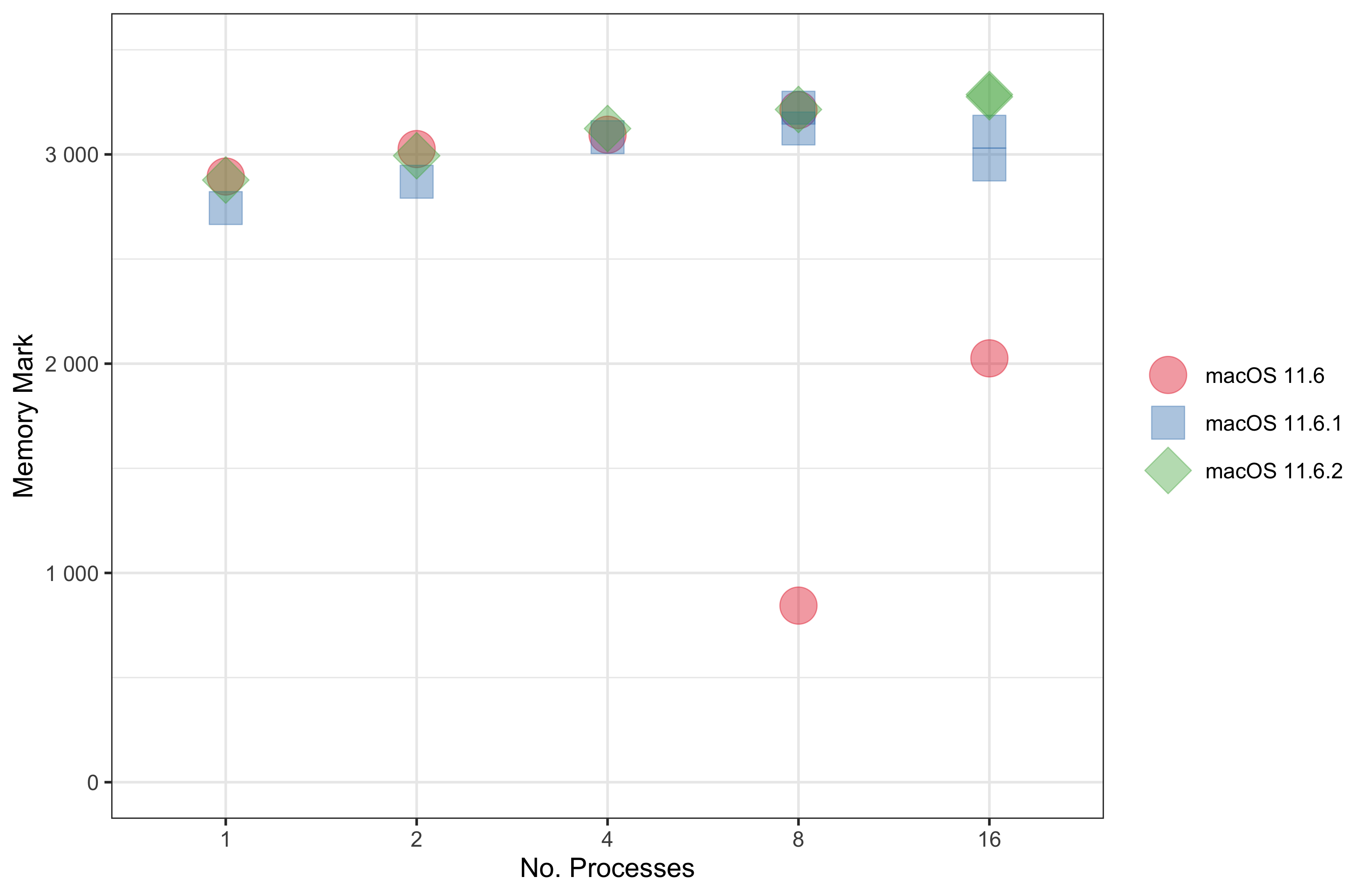 Di primo acchito si potrebbe pensare che l’anomalia sia collegata alla versione del sistema operativo usato, perché i due valori anomali si ottengono con la versione iniziale 11.6 di macOS Big Sur (Figura 6). Ma se è plausibile che gli aggiornamenti successivi di Big Sur abbiano introdotto qualche ottimizzazione nella gestione della memoria del processore, questa ipotesi non spiega perché il Memory Mark misurato con 8 processi in parallelo sia decisamente peggiore di quello con 16 processi.