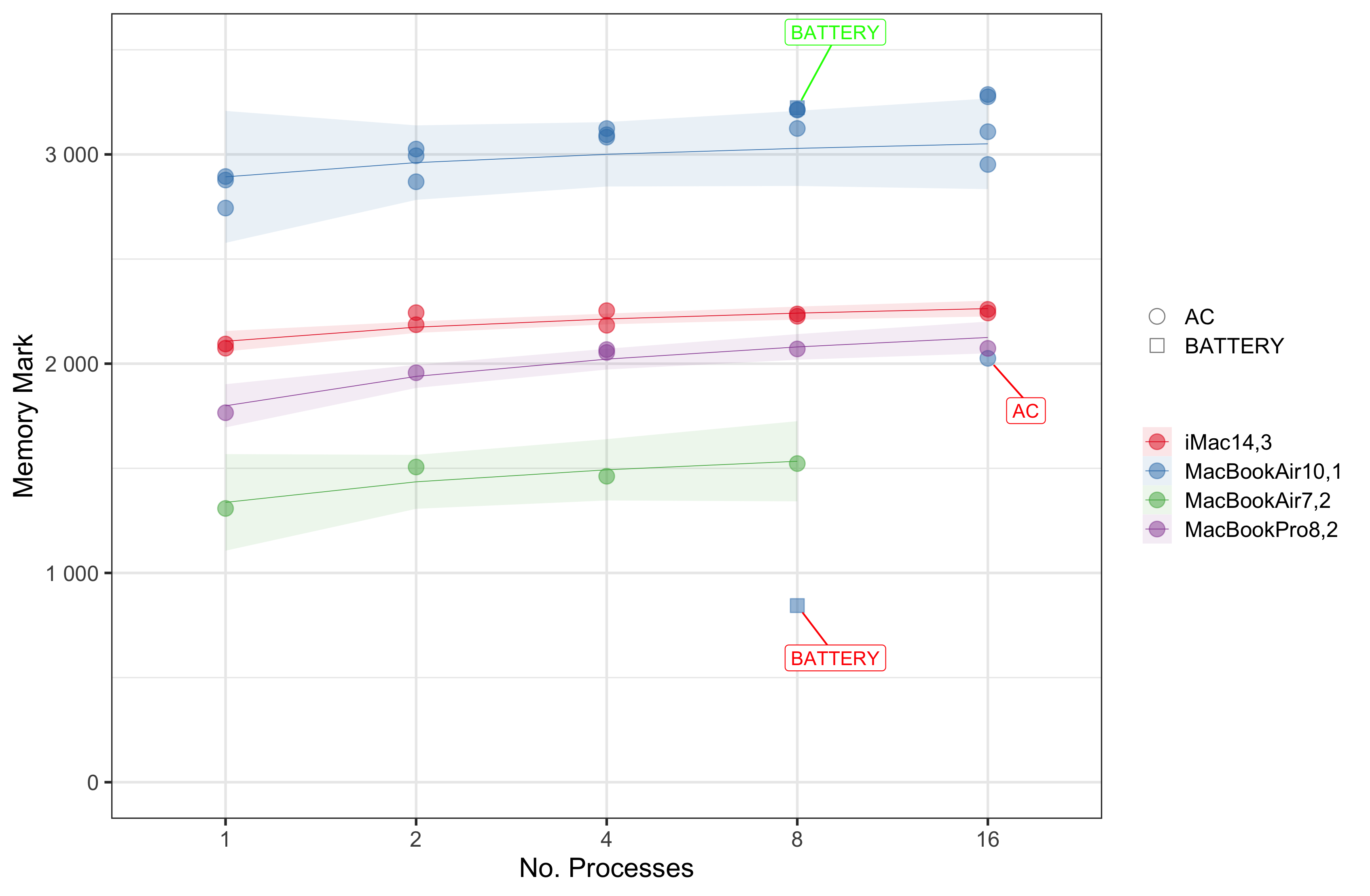 Figura 5. Memory Mark in funzione del numero di processi in esecuzione nella CPU. Legenda: (iMac14,3, cerchi rossi) iMac i5 2013/Mojave 10.14.6, (MacBookAir10,1, cerchi blu) MacBook Air M1 2020/Big Sur 10.6.x, (MacBookAir7,2, cerchi verdi) MacBook Air i5 2015/Mojave 10.14.6 i5 , (MacbookPro8,2, cerchi viola) MacBook Pro i7 2011/Big Sur 10.6.2.