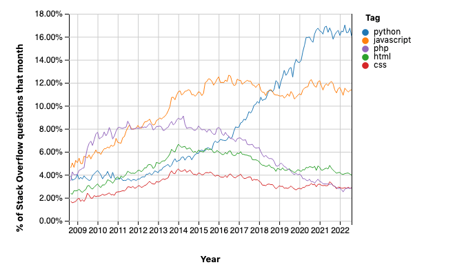 pandasdi Python (una libreria fondamentale per chi usa Python per l’analisi dei dati) assommano al 3% del totale, le principali librerie per il machine learning (TensorFlow, Keras, PyTorch, scikit-learn, OpenCV, NLTK) fanno un altro 2%, mentre quelle suDjangoeFlask(le principali librerie Python per lo sviluppo di applicazioni per il web) sono quasi al 2.5% del totale generale. Chiaramente queste domande vengono anche conteggiate come domande relative a Python. ↩︎ -