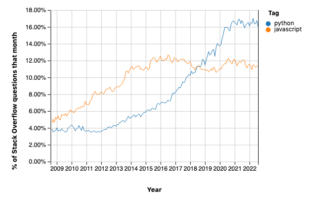 Perché è una metrica fasulla? Perché finché siamo sui grandi numeri e confrontiamo la popolarità di Python con quella di JavaScript può anche avere senso basarsi sul numero di domande poste su StackOverflow per valutarne la diffusione.