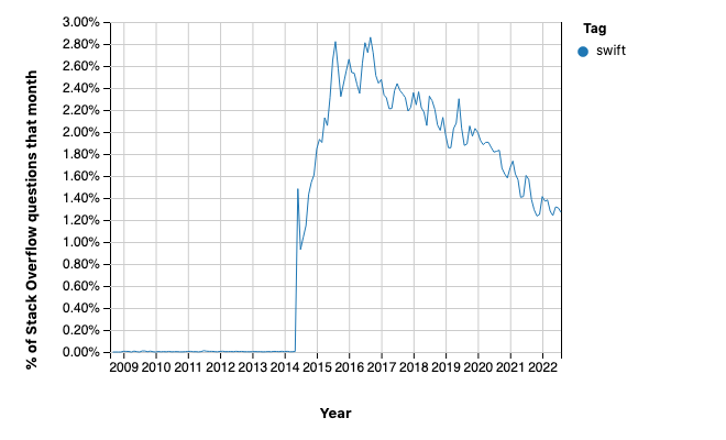 Ma la cosa più sconcertante è pretendere di confrontare la popolarità (o meno) dei linguaggi di programmazione utilizzando una metrica fasulla come la percentuale di domande poste ogni mese su StackOverflow relativamente ad uno o ad un altro linguaggio. In base a questa percentuale, la popolarità di Python è cresciuta costantemente fino alla fine del 2020, per poi stabilizzarsi al 16% del totale delle domande su StackOverflow, mentre quella di Swift dopo aver raggiunto un massimo del 3% è in declino e ora si aggira nei dintorni dell'1.5%.