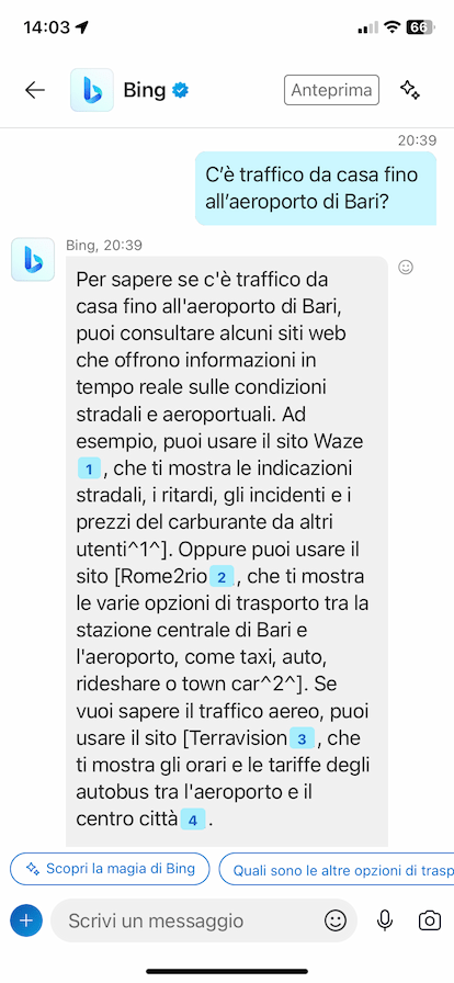 Nel poco tempo che avevo ho provato e riprovato, ma non sono riuscito a convincere Bing a darmi le informazioni corrette. Al massimo, quando più tardi mi sono deciso a chiedergli esplicitamente se c’era traffico da casa all’aereoporto di Bari, ha aperto sconsolato le braccia e mi ha consigliato di guardare sul web.