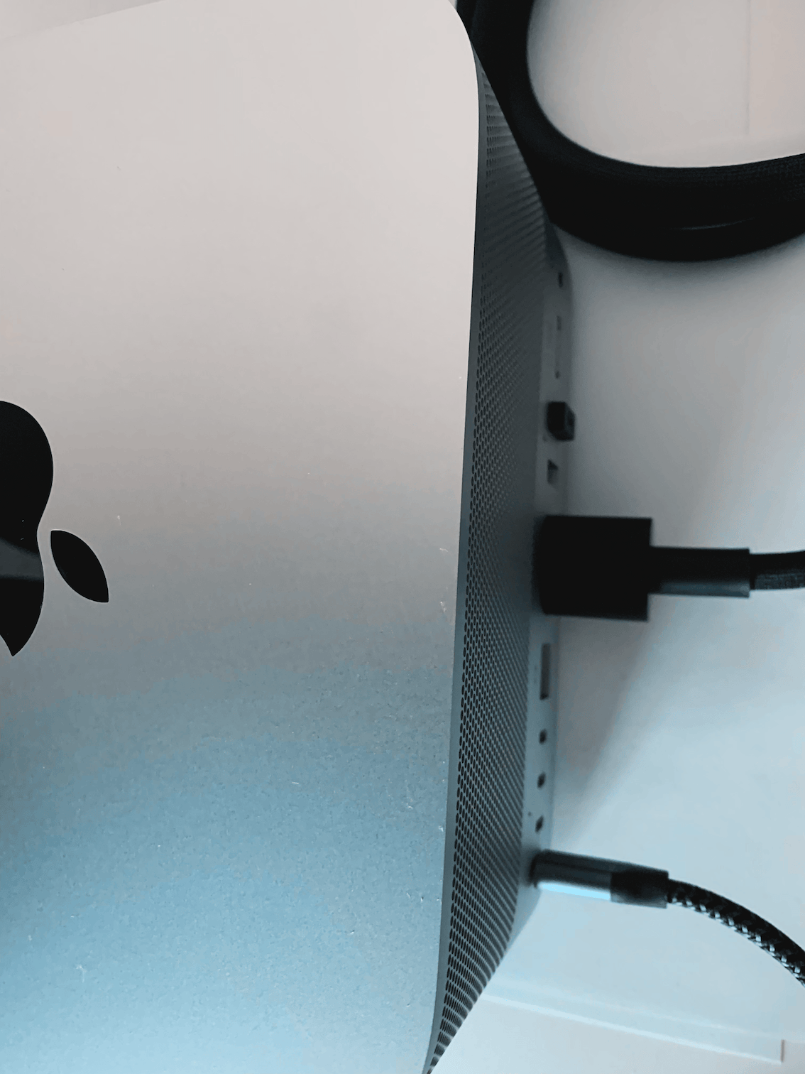 Collegare il cavo di alimentazione e quello USB-C per il monitor è un attimo. Anche collegare la tastiera e il mouse wireless (Logitech, entrambi ottimi) è facilissimo, mi basta togliere il dongle USB dal mio solito Mac e infilarlo in una porta del Mac Studio, senza bisogno di configurare niente o di trafficare con il Bluetooth.