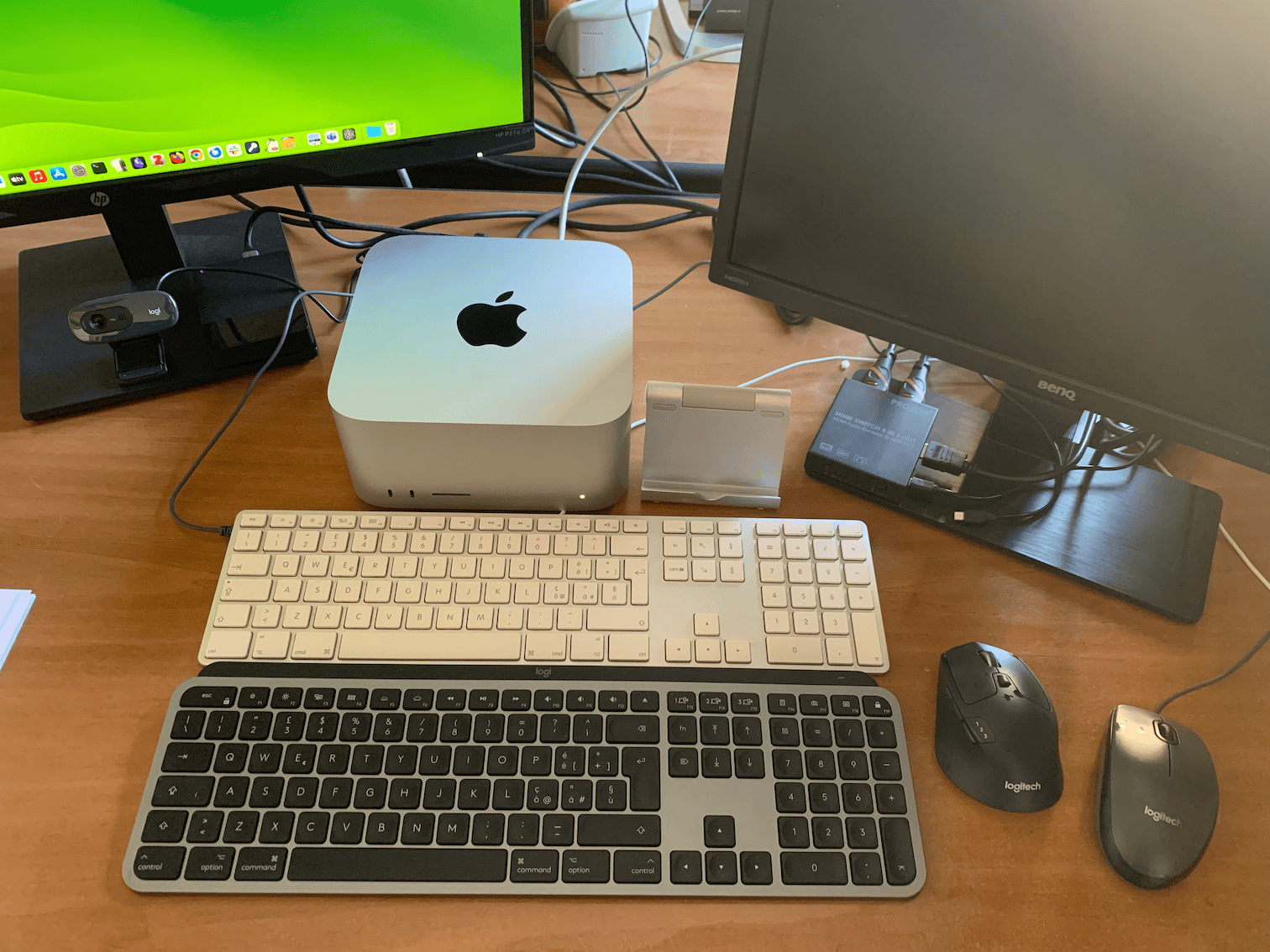 Tutto l’unboxing e la configurazione del Mac Studio l’ho fatta a casa mia, per poter lavorare in pace evitando il solito caos dell’istituto. Ma dopo una settimana il Mac Studio ha traslocato, prendendo posto al centro della scrivania del mio ufficio, in mezzo a monitor, tastiere, mouse, cavi e ammennicoli vari.