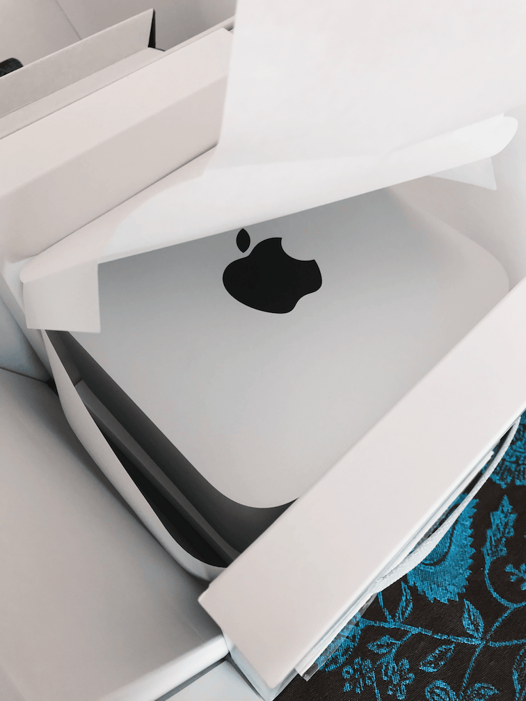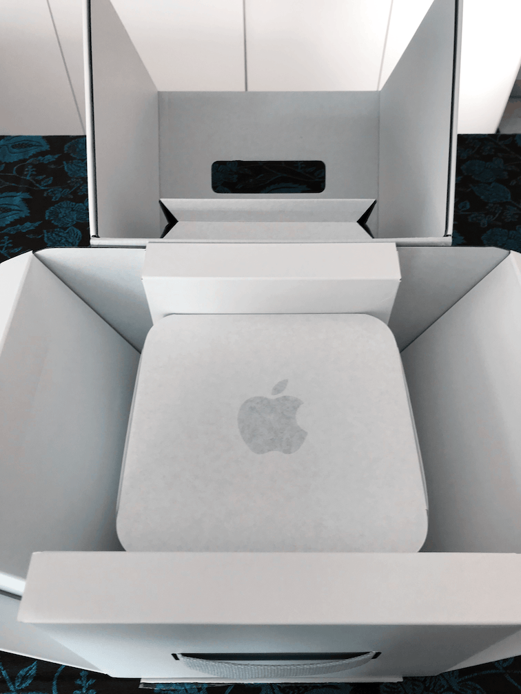 Sembra davvero un Mac Mini cresciuto in altezza e ora sembra pesare il giusto in rapporto alle sue dimensioni. Tutto il peso aggiuntivo è dovuto alla scatola che, ora si vede benissimo, è studiata per proteggere al meglio il prezioso oggetto al suo interno.