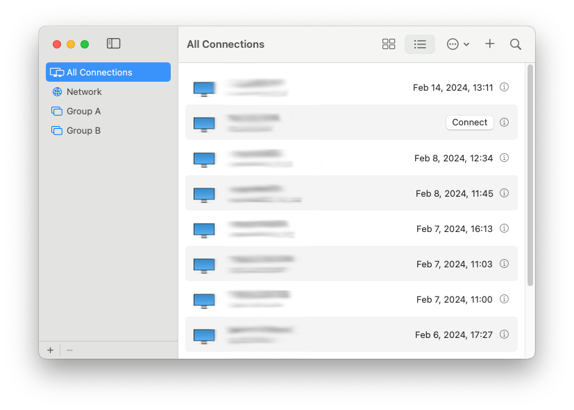 Ma tornando ad oggi e a Sonoma, la cosa più interessante della nuova Condivisione Schermo è che l’applicazione ora presenti una storia di tutte le connessioni eseguite, permettendo di ricollegarsi con facilità ai computer usati più spesso e di creare gruppi coerenti di connessioni ai diversi computer che usiamo.