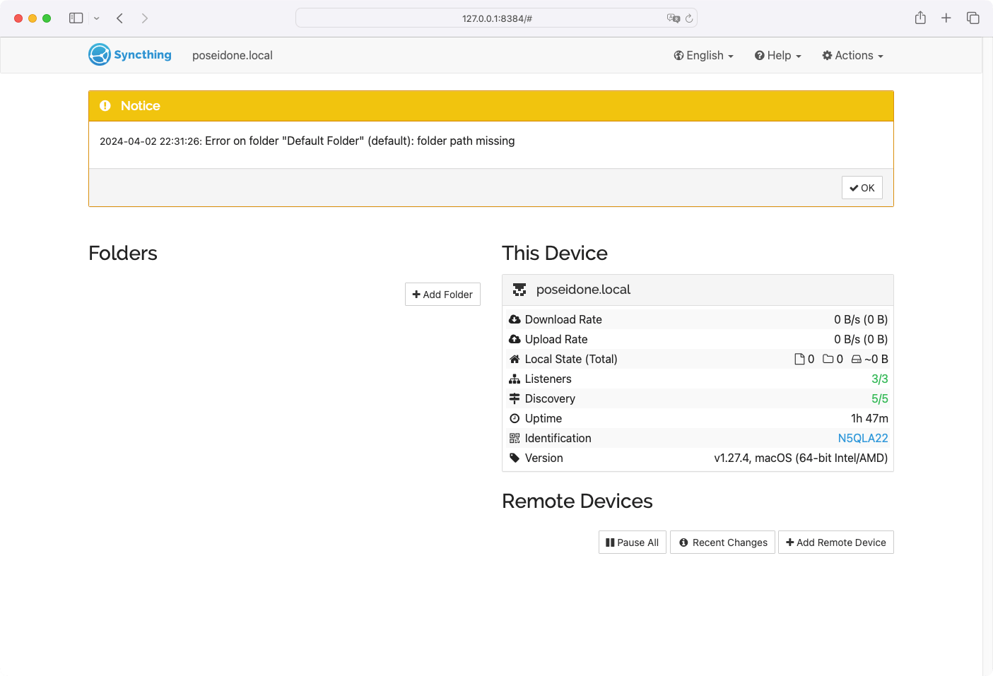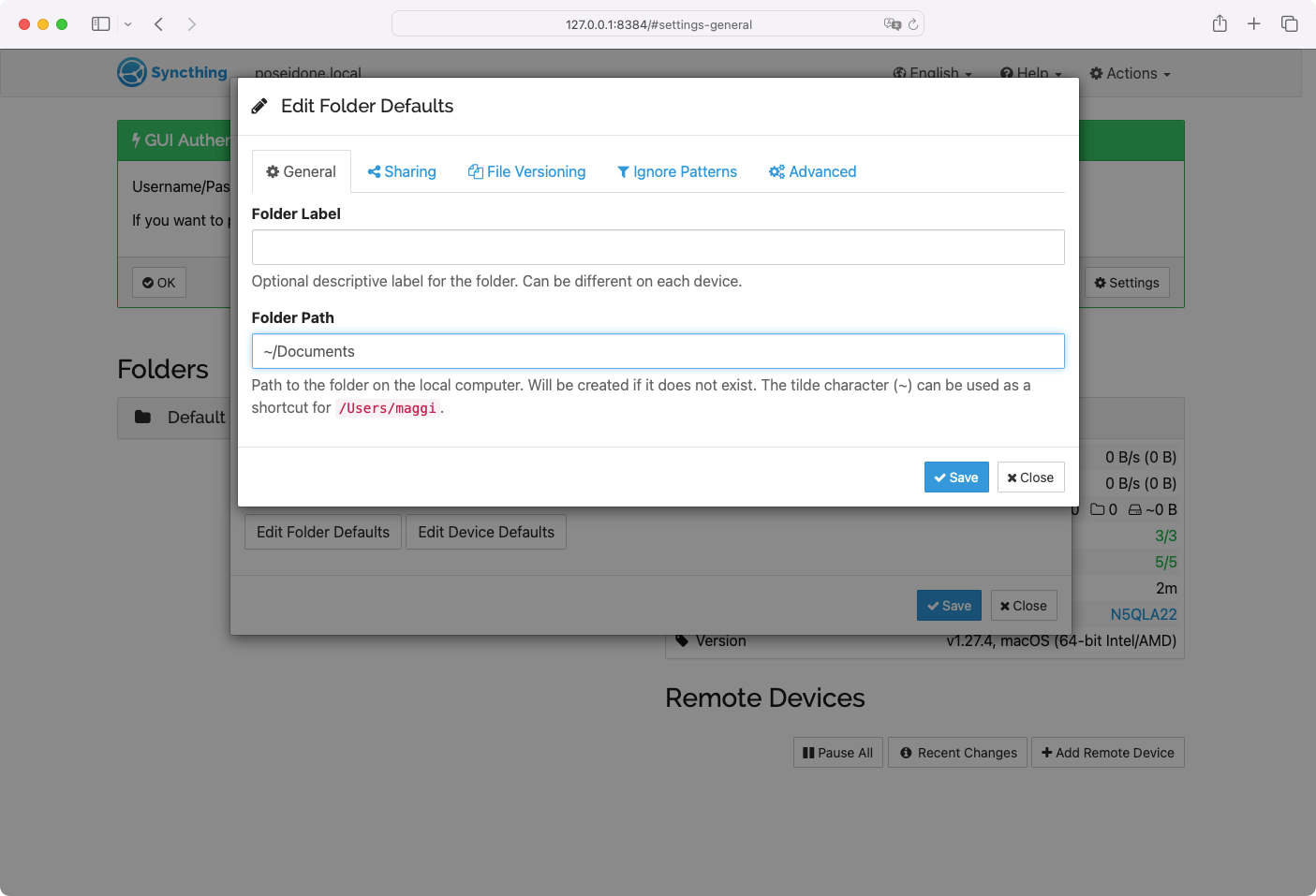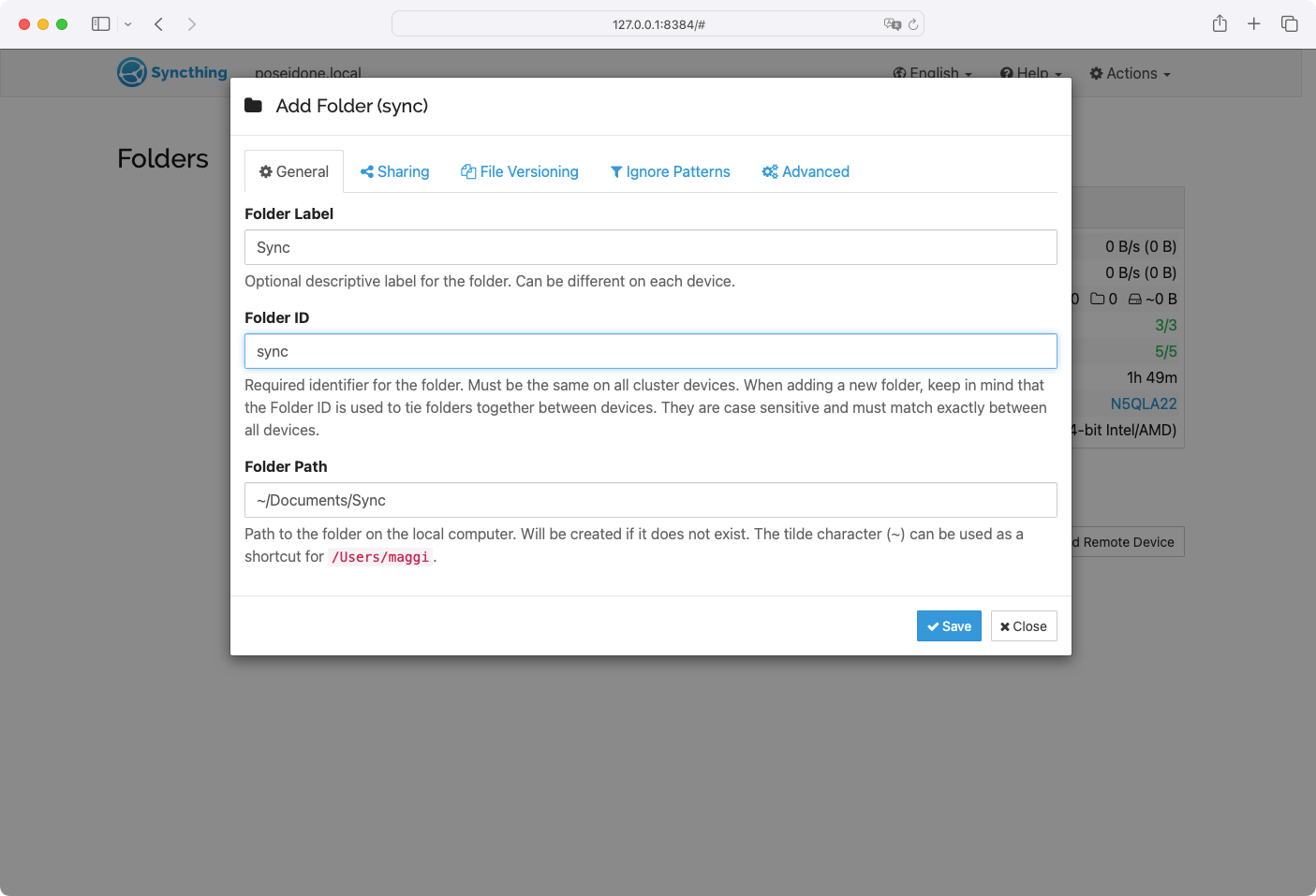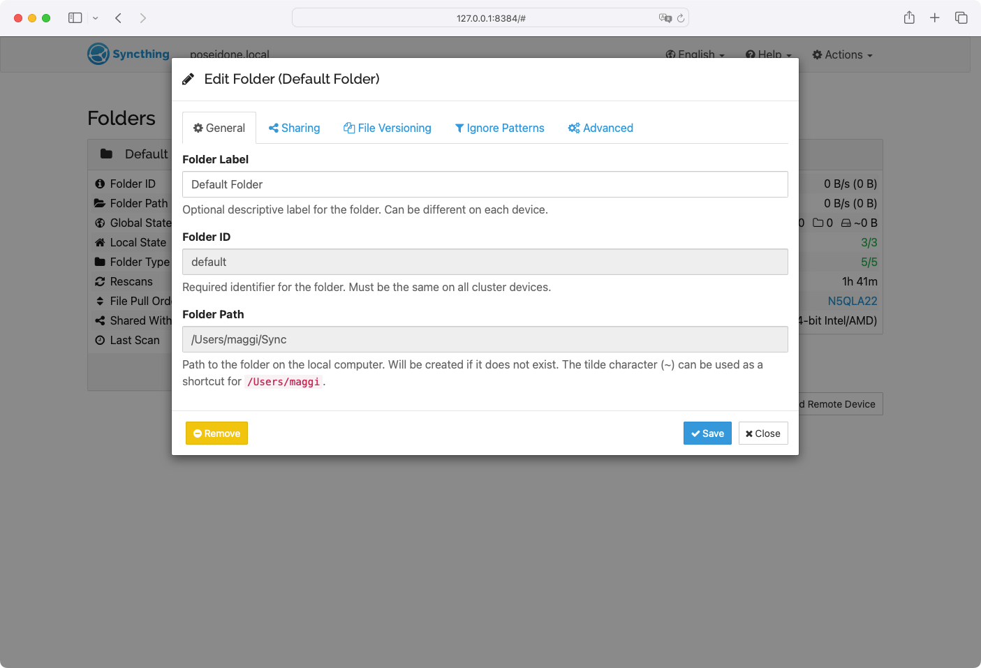 Syncthing è uno di questi, infatti una delle prime cose che faccio dopo averlo installato su un nuovo Mac è modificare la posizione della cartella di sincronizzazione di default Sync dalla Home a ~/Documents (~/Documenti per chi usa macOS in italiano).