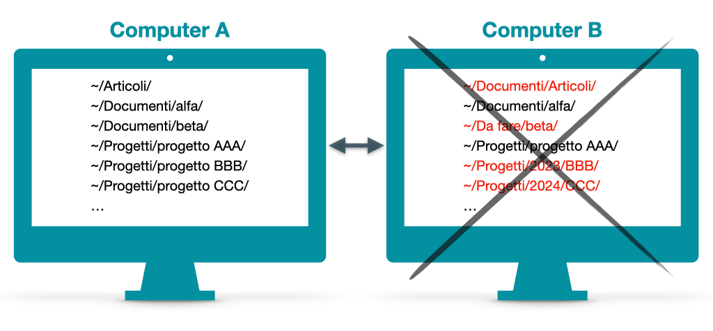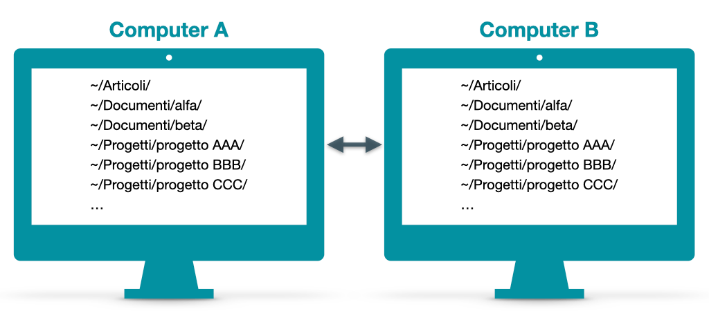 Dopo aver collegato i primi due dispositivi tramite Syncthing, la strategia più immediata per aggiungerne un terzo è quella di sincronizzarlo solo con uno dei due. Allo stesso modo, il quarto viene sincronizzato con il terzo e così via, creando una struttura lineare dove ciascun computer è connesso solo ad altri due dispositivi della rete.