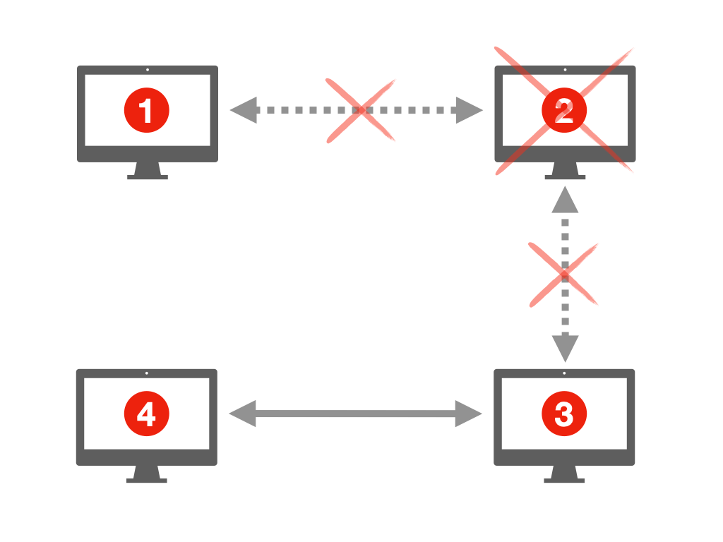 Il problema nasce quando uno dei computer viene spento o smette di funzionare, perché a quel punto i dispositivi a monte dell’interruzione non riescono più a sincronizzarsi con quelli a valle.