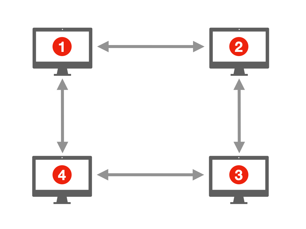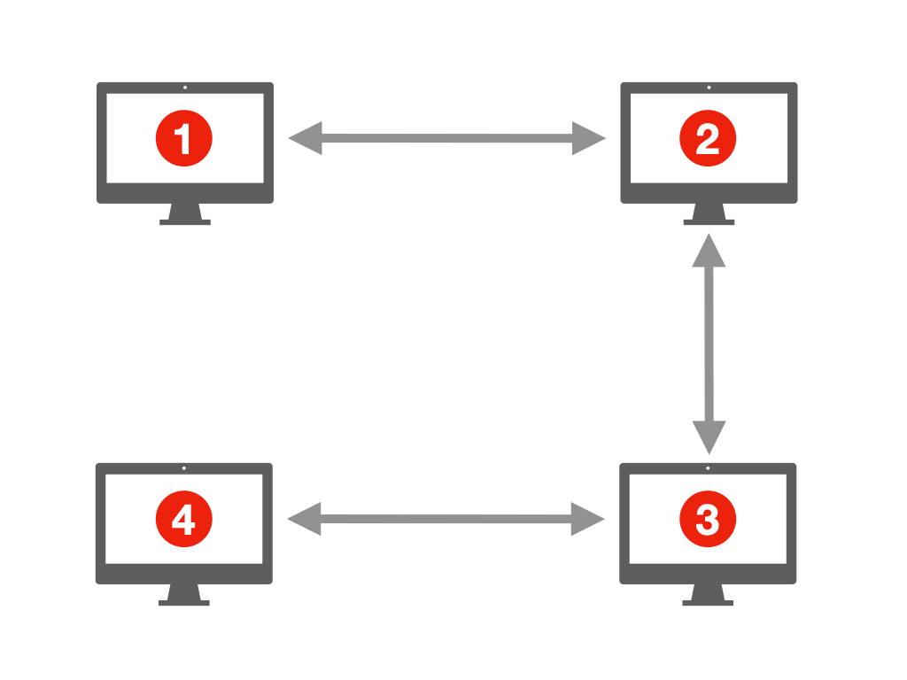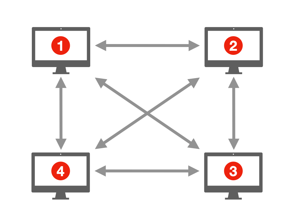 Non c’è bisogno di dire che il metodo di collegamento di gran lunga più affidabile e resiliente è quello a maglia (mesh), dove ogni computer è collegato a tutti gli altri dispositivi della rete. Una struttura di questo tipo continua a funzionare tranquillamente se uno o più dispositivi smettono di funzionare, ma il numero di collegamenti reciproci da stabilire cresce rapidamente all’aumentare di dispositivi coinvolti.