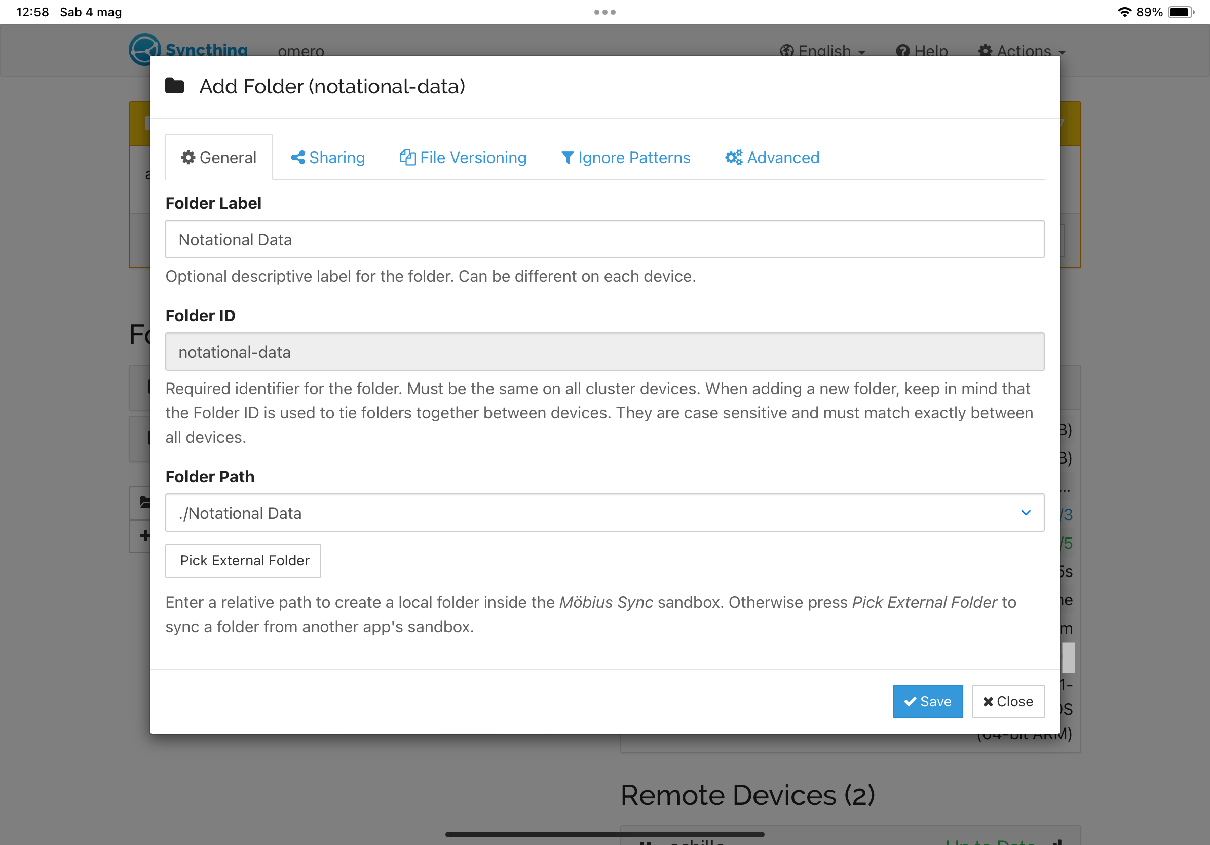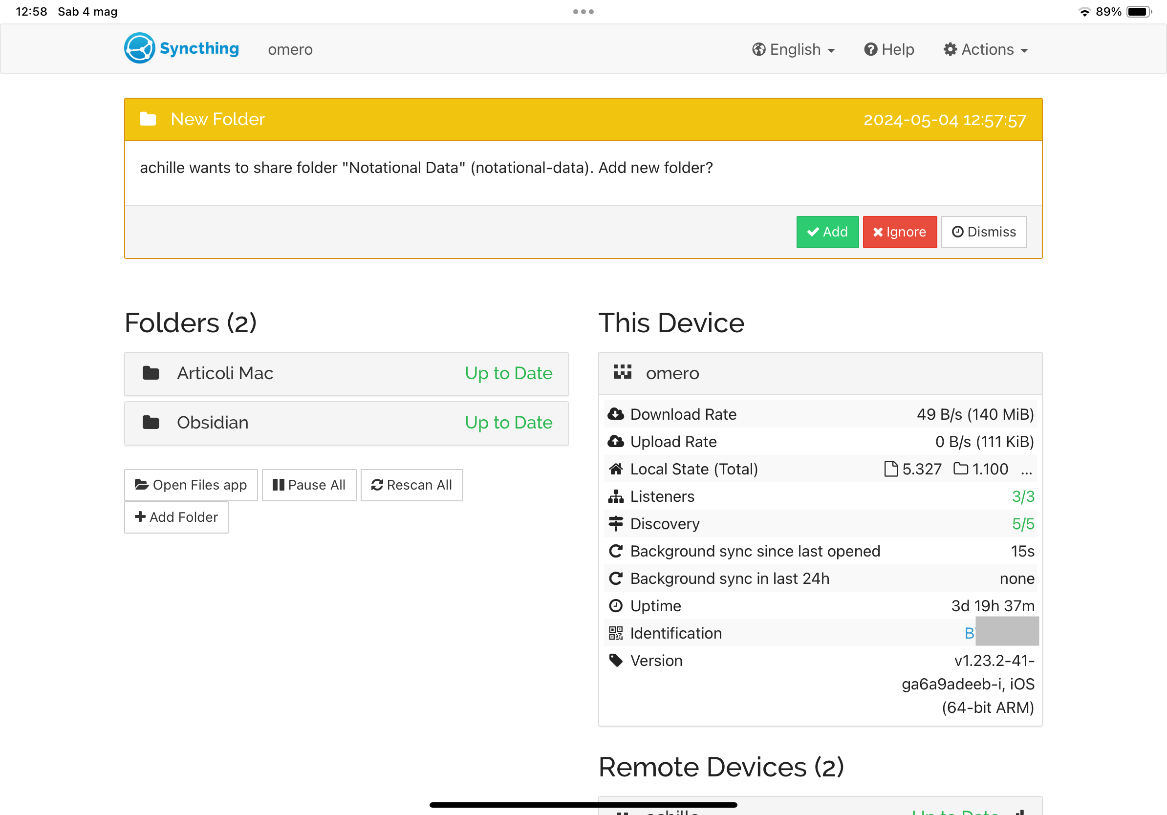 Anche il collegamento del dispositivo iOS con gli altri dispositivi su cui gira già Syncthing è identica a quanto descritto nell’articolo Syncthing, installazione e uso, con la differenza che ora possiamo lavorare più comodamente piazzando l’iPhone o l’iPad sulla scrivania, proprio accanto al computer a cui vogliamo collegarlo.