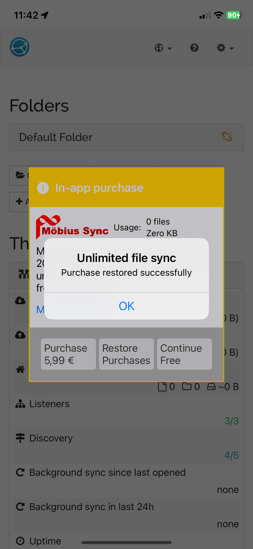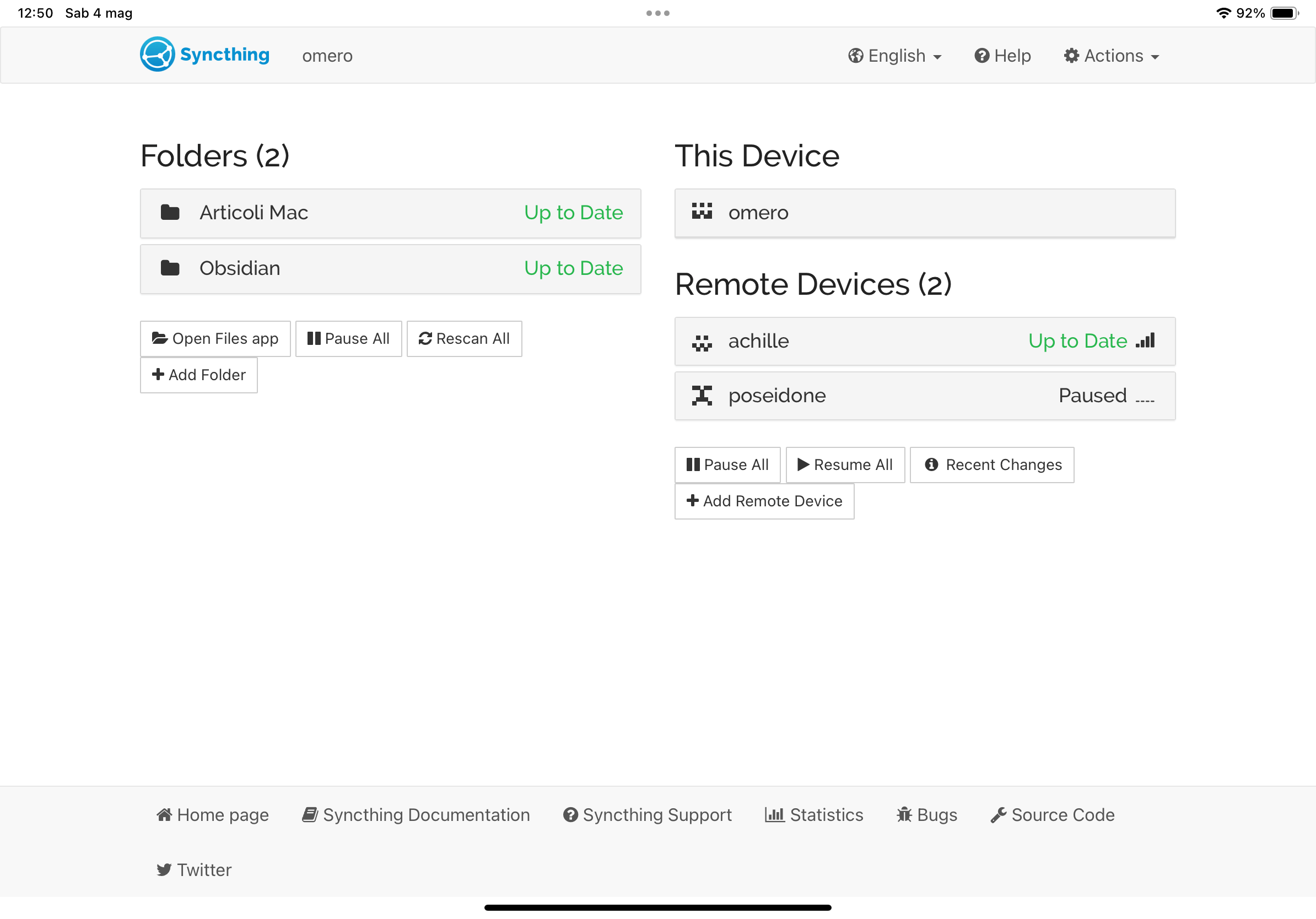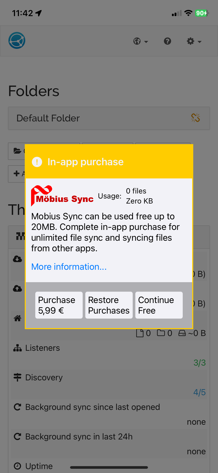 Invece, per motivi che mi sfuggono, non esistono delle app ufficiali di Syncthing per iOS e iPadOS (da ora in poi scriverò solo iOS per intendere entrambi i sistemi operativi mobili di Apple). Per fortuna ci hanno pensato quelli di Pickup Infinity Limited, che hanno sviluppato Möbius Sync Pro, un ottimo client di Syncthing per iOS che replica in modo perfetto l’interfaccia web di gestione del programma.1