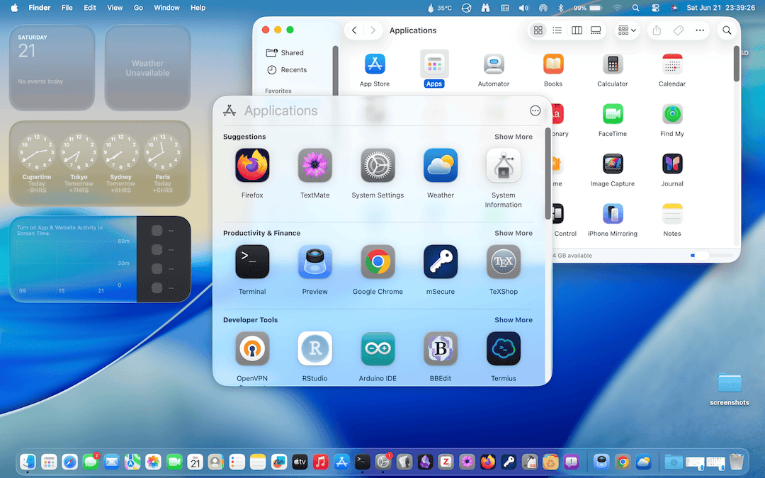 Di conseguenza, mi limiterò a descrivere le mie prime impressioni sulla nuova interfaccia grafica, concentrandomi in particolare sul Finder, che è una delle applicazioni più usate in assoluto, e sulle Impostazioni di Sistema, che è fondamentale quando si prende confidenza con un nuovo sistema operativo. Dopo il rilascio ufficiale a settembre, ci sarà sarà tempo per una valutazione più approfondita.