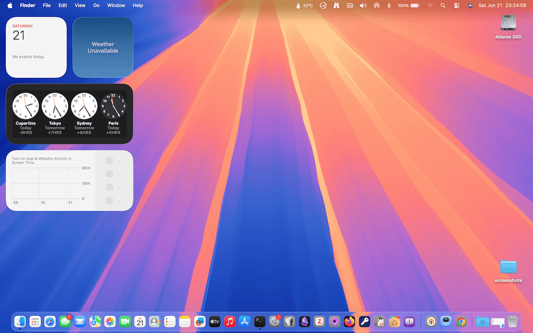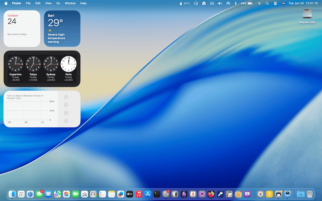 Da qui si arriva direttamente al Desktop del Mac, che ora mostra alcuni widget sul lato sinistro della schermata (alcuni widget sembrano non funzionare solo perché gli screenshot sono stati fatti la sera tardi al mare, senza attivare il collegamento ad internet).