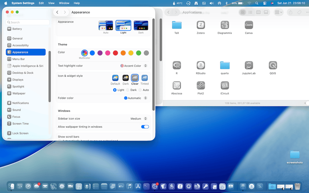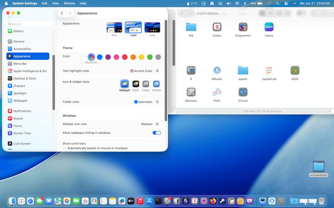 Dirò qualcosa invece sulla nuova funzione che cambia globalmente i colori delle icone e dei widget di macOS Tahoe. Qui si vede lo stile di Default delle icone (e dei widget) che, a parte il bordo grigiastro di cui ho già detto, è quello a cui siamo sempre stati abituati.