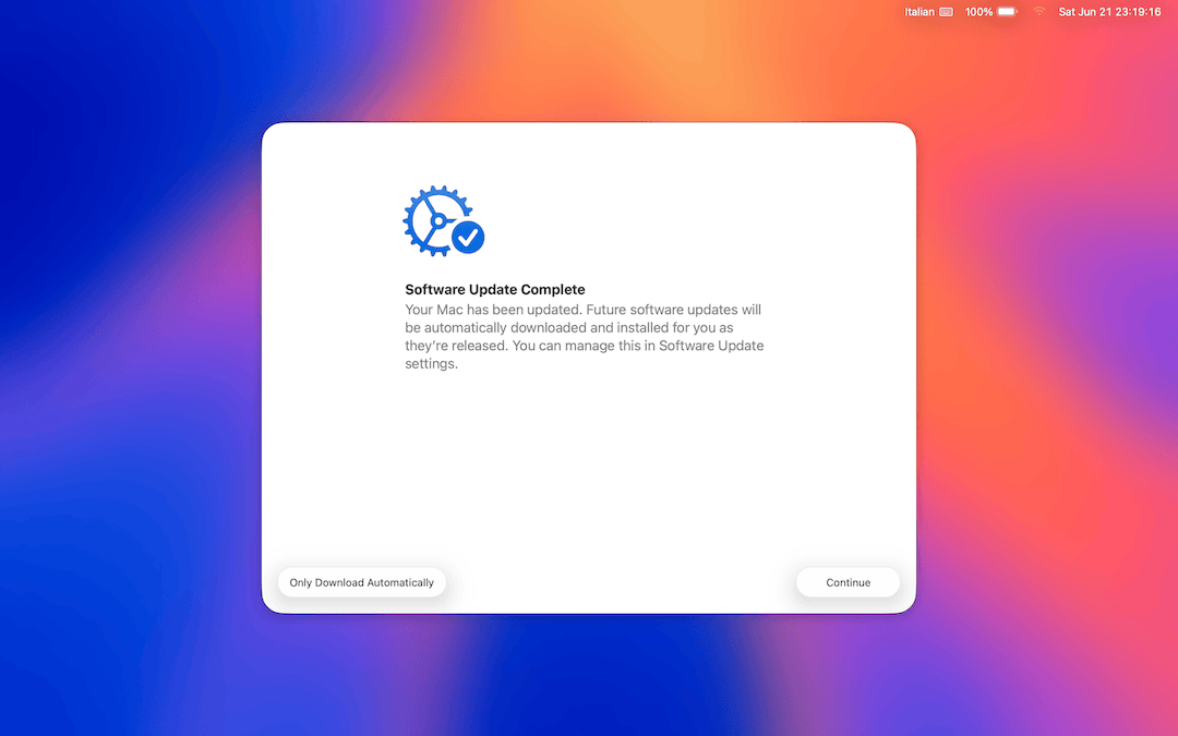 Una volta premuto Continua compare il Welcome Screen di Tahoe che, poverino, sembra una scritta fatta con il dentifricio sovrapposta allo sfondo di default del mio Mac. Purtroppo sono passati da un pezzo i tempi dei magnifici Welcome Video delle prime versioni di macOS, quelle con i nomi di felini.