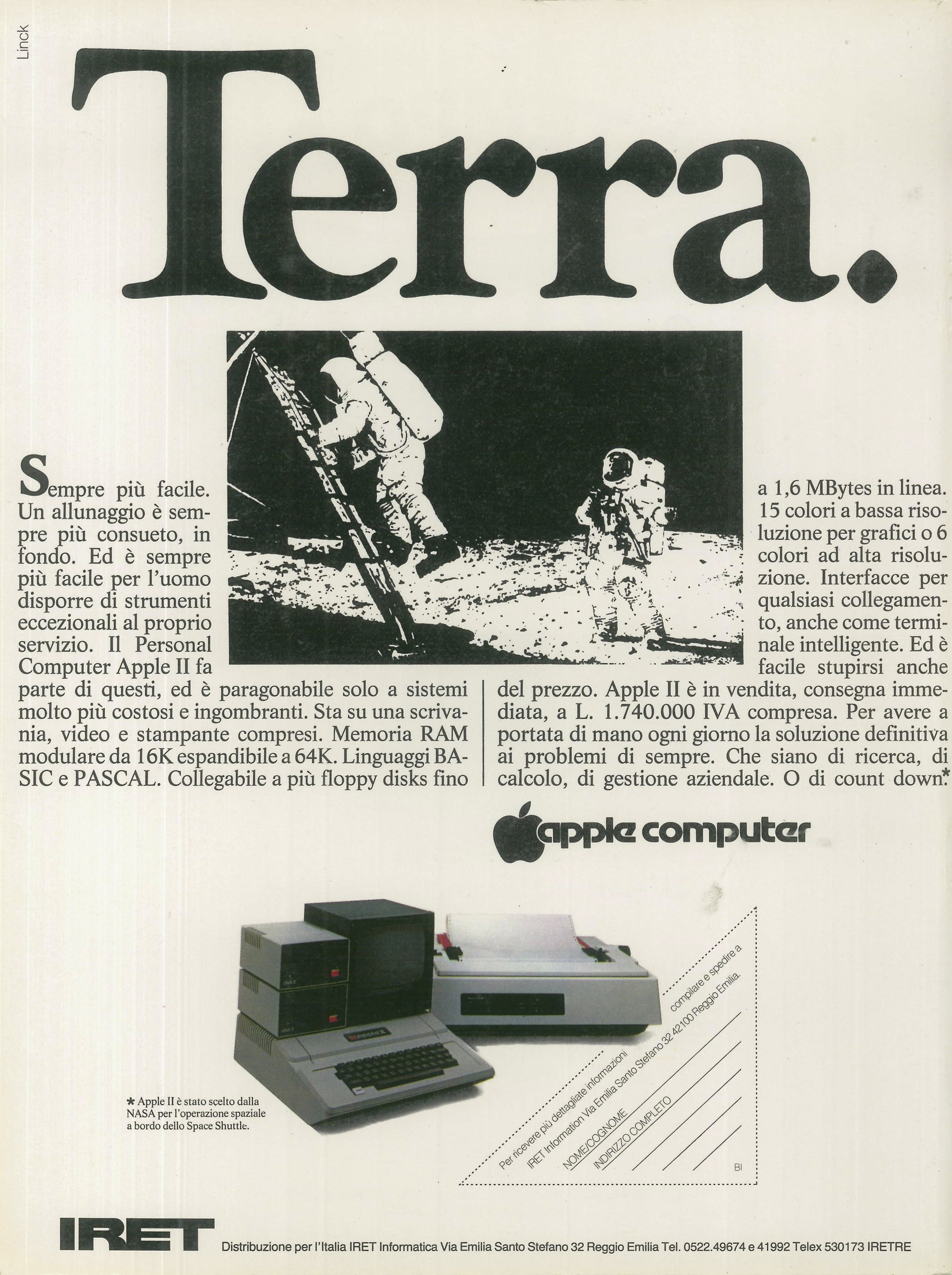 Se confrontate il prezzo dell’Apple II base riportato in questa immagine con quello della pubblicità su Bit, noterete che in meno di due anni il prezzo dell’Apple II base era aumentato di ben un milione di lire (più o meno 1.000-1.500 euro odierni) a causa dell’inflazione galoppante di quegli anni. ↩︎