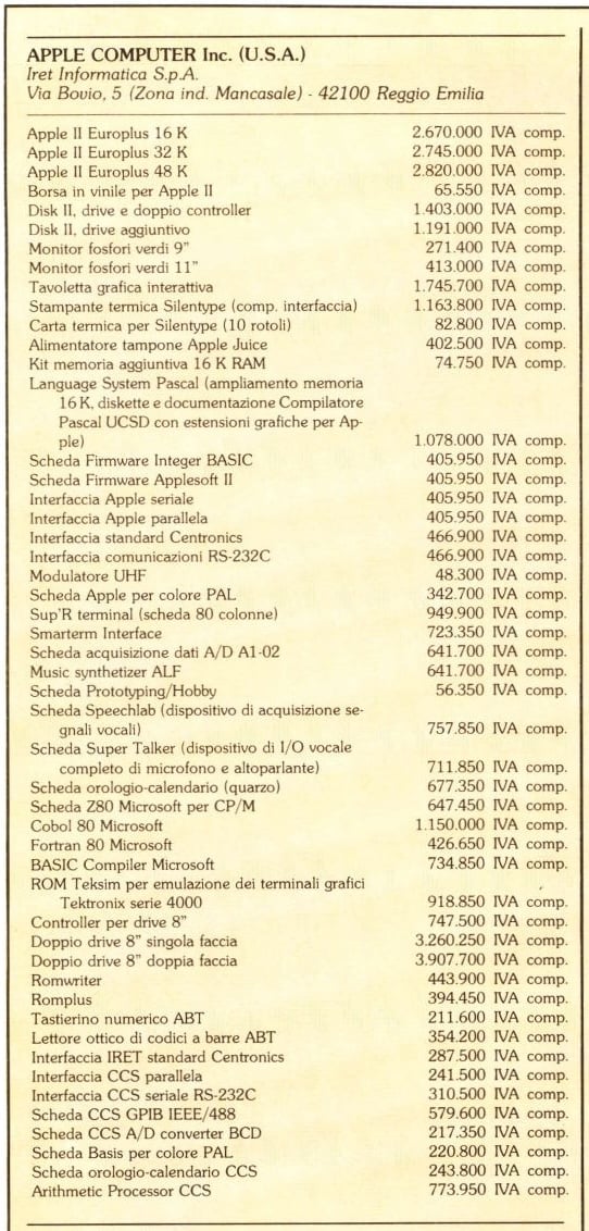 – Listino completo dei prodotti Apple a settembre 1981 (tratto da MC Microcomputer no. 1, Settembre 1981, pagina 84).